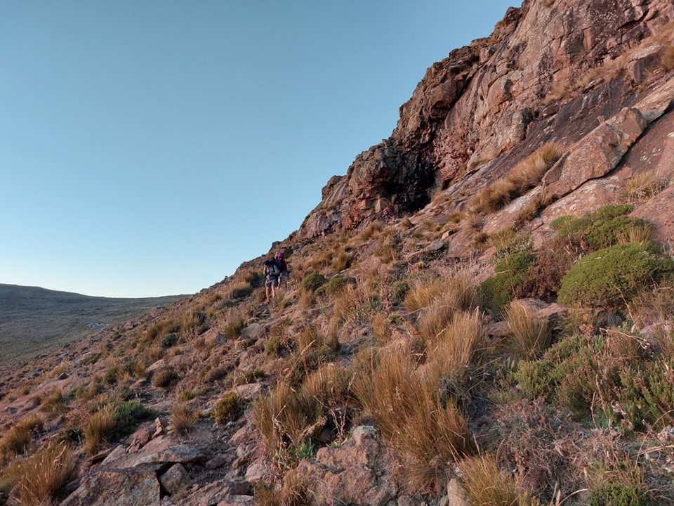 The next day, we walked to the base of Corner Pass. This is a very challenging pass. Give yourself a good few hours to walk it. There is a easier pass (Judges pass) which is one valley over. Once at the top of the pass, it is about a 6km walk. Just because you at the top of the berg (Lesotho) don't think it is flat. There is still a long hill you walk up but the Cave is near so your spirits are high. The Cave is a very rewarding sight. It is set about 400m from the escarpment. People have built a rock wall which adds lots of protection from wind and rain. The Cave can comfortably sleep 8 but with a squeeze it can fit 12. Water is also abit of a problem. The nearest water source is 400m away at the escarpment. The views you get while getting water are absolutely amazing. You can look over the edge of the escarpment and see a 1000m drop. BE SAFE!!! In winter the Cave does get very very cold.