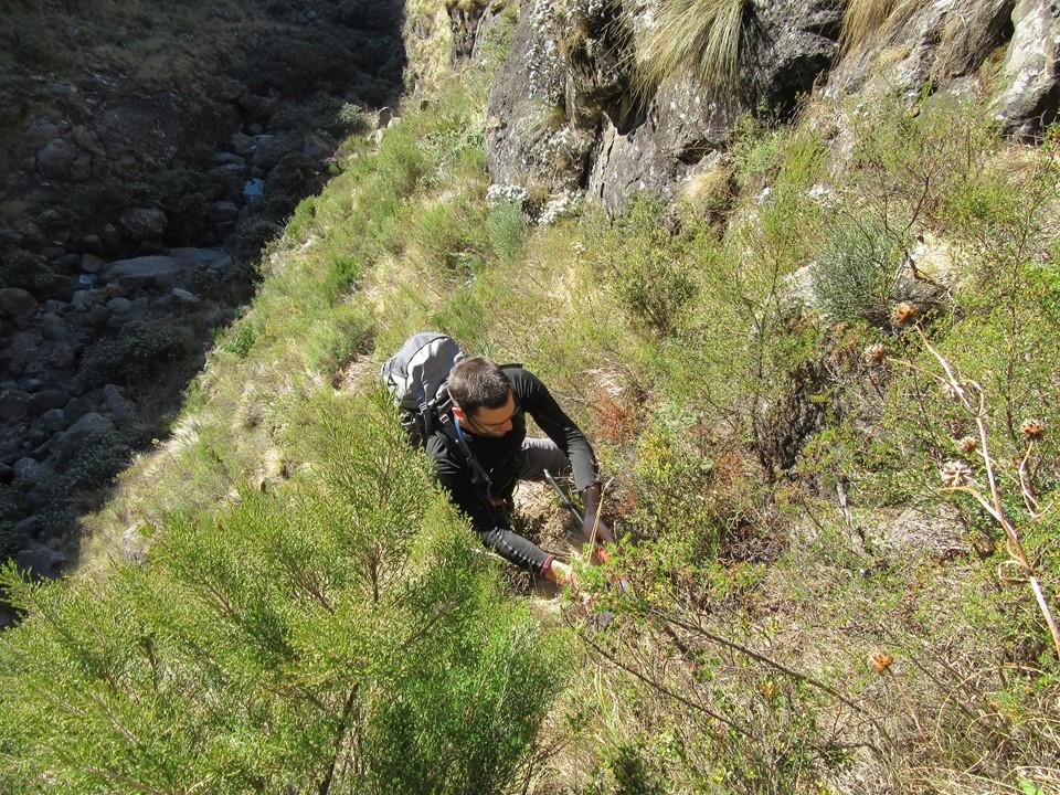Initially it is necessary to move left onto the steep grassy slopes to bypass some waterfalls. There is a large rock pinnacle which you walk behind.