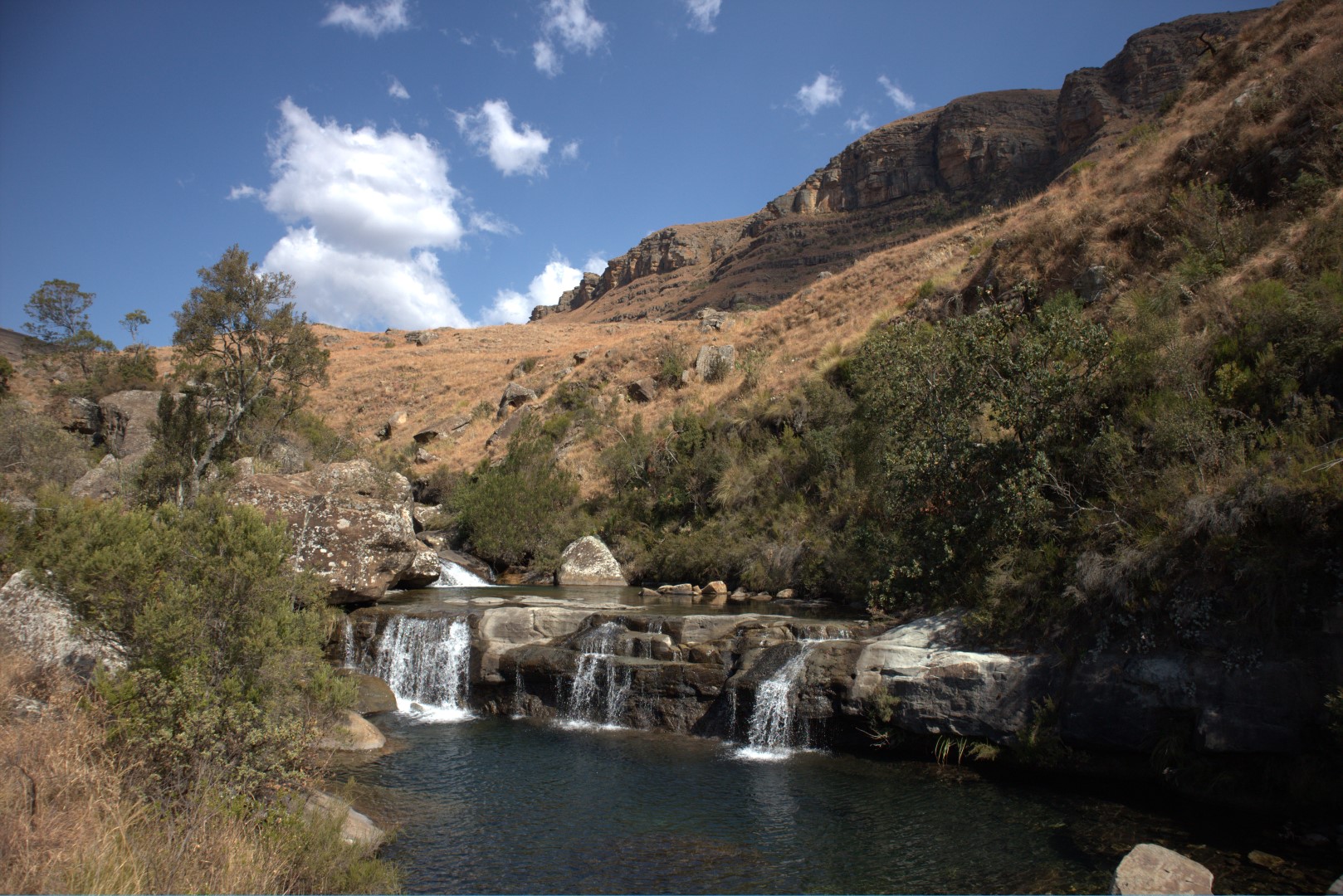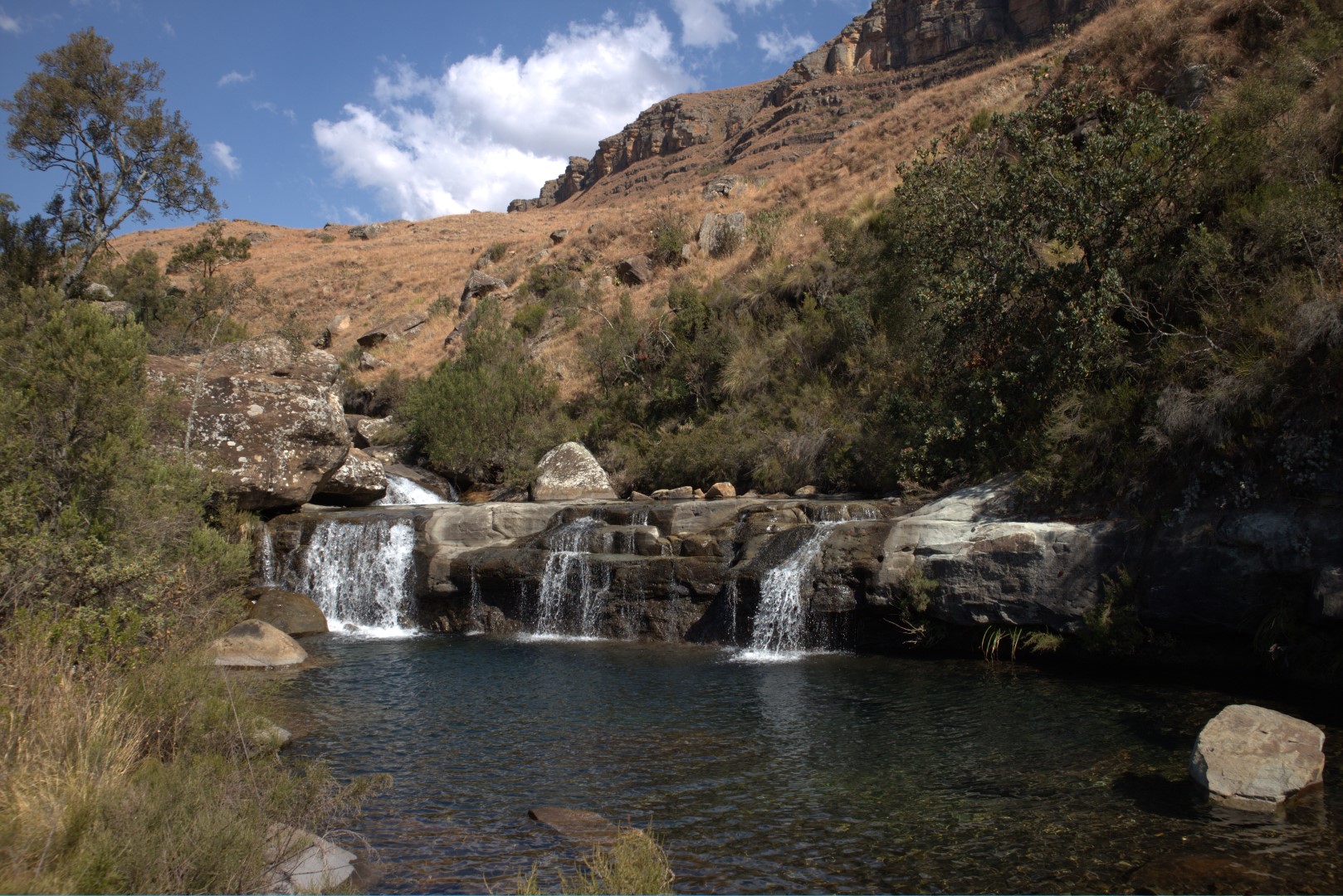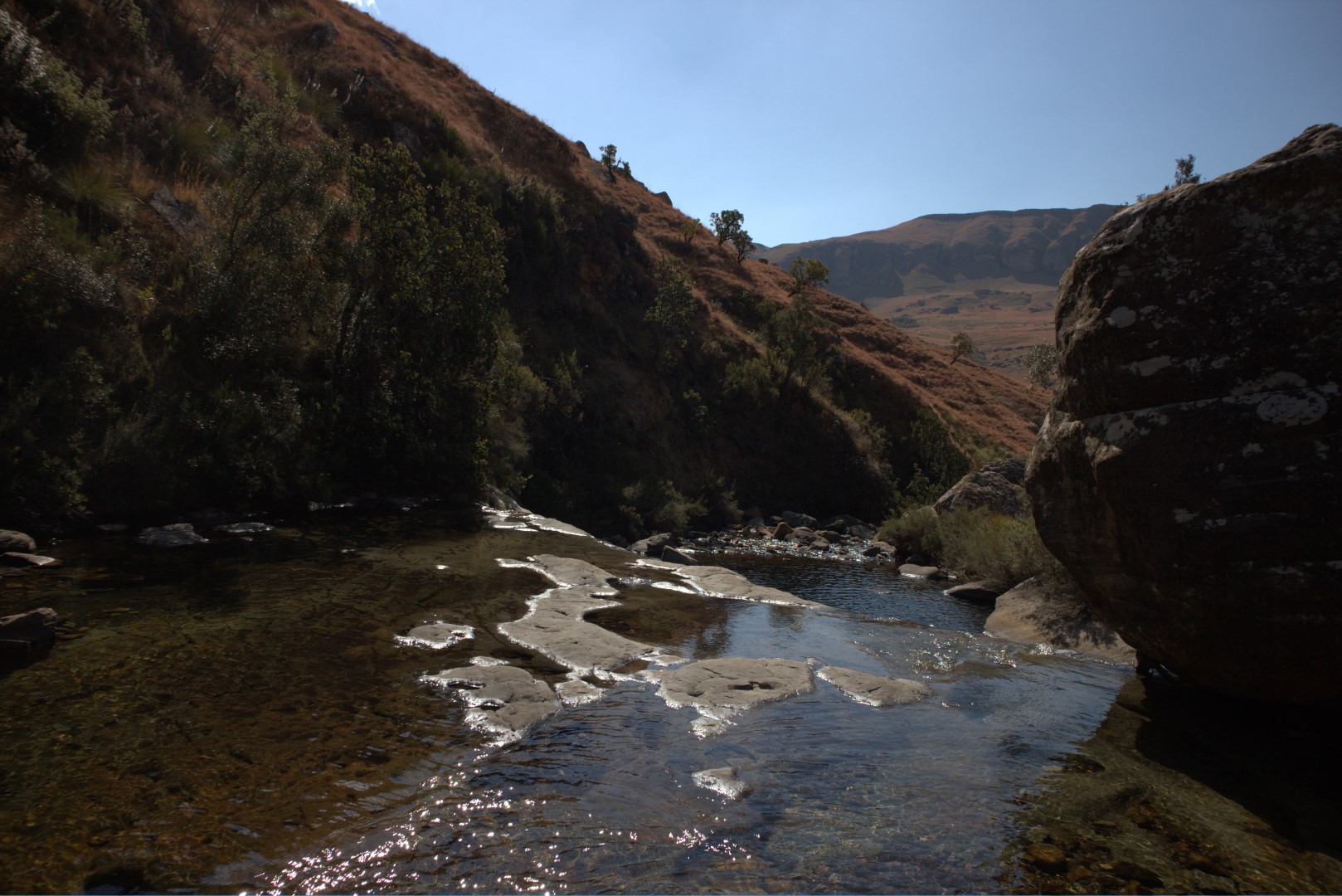 Roman Baths are easily found and are easy to get into it. The surrounding rocks are convenient to keep your goods from getting wet. There are Lots of interesting parts of the baths to explore. Very secluded. A hidden gem in the Drakensberg.